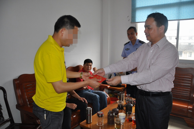 3月28日下午4时许,城南派出所协警韦某宽在所领导的带领下,对正在岑城镇樟木古街大井旁边的一间烂屋内吸毒的吸毒人员陈某林、王某东、胡某成等人实施抓捕时,不慎被负隅顽抗全力企图逃跑的吸毒人员推倒落地受伤,经送医院诊断为左腓骨远端骨折而住院治疗。获悉情况后,受副市长、公安局长梁兵的委托,3月29日上午,公安局政委黄云龙、副局长梁华明带领政工室、城南派出所的领导,到医院看望慰问了城南派出所因公受伤的协警韦某宽,为韦某宽送上了慰问金和慰问品,送去了局党委的关怀和温暖,对韦某宽在抓捕吸毒人员时表现出来的英勇无畏和高度负责的敬业精神予以了高度赞扬,叮嘱他要安心养伤,积极配合医院治疗,争取尽快康复重回工作岗位,并叮嘱他在今后工作中要提高防范意识,注意保护好自身的安全。对局领导的看望慰问及组织的关怀和问候,韦某宽表示衷心感谢,并表示一定会安心养好伤,争取早日康复,重返工作岗位。