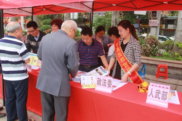 4月15日,岑溪市政法委牵头组织市武装部、政府办、法院、检察院、公安局、司法局等单位在市大广场开展“依法严惩黑恶势力,维护社会和谐稳定”扫黑除恶及反邪教宣传活动。现场工作人员除宣传扫黑除恶相关事项外向群众介绍邪教的种类、特征、危害等相关知识;开展反邪教签名活动;发放各类反邪教宣传品1800余份。参与群众纷纷表示,通过活动认识到了邪教的危害,以后要坚决抵制邪教。