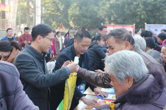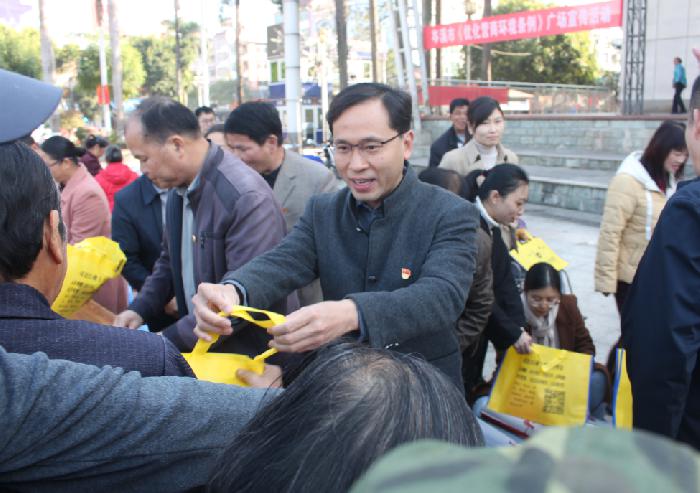 (市委常委、政法委书记练泽明在为群众发放宪法宣传资料)
