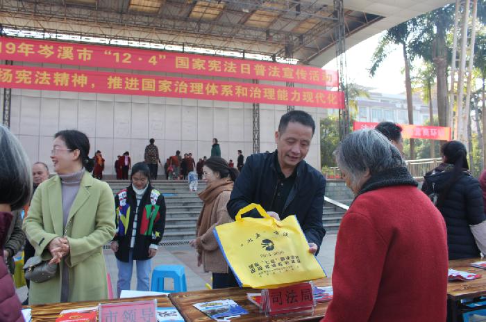 为深入贯彻落实习近平新时代中国特色社会主义思想,党的十九大,十九届二中、三中、四中全会精神,弘扬宪法精神,推进国家治理体系和治理能力现代化,岑溪市委全面依法治市委员会办公室(设在市司法局)、市司法局牵头,市有关单位共同参与,在市人民广场举办岑溪市2019年“12·4”国家宪法日普法宣传活动。把国家宪法日宣传活动作为践行“不忘初心、牢记使命”主题教育的重要实践,作为贯彻落实全面依法治国要求的有力举措,作为巩固党和国家机构改革成果的重要反映。