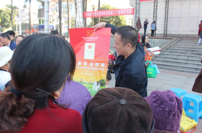(市司法局党组书记、局长莫健松为群众发放宣传资料,宣传宪法有关知识)