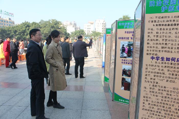 (市委常委、政法委书记练泽明,市人大常委会副主任唐永清等在参观现场陈列的法治宣传展板)