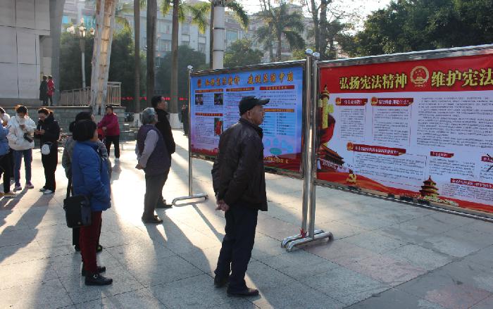 (现场群众在参观学习宪法宣传展板内容)