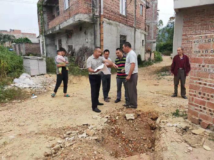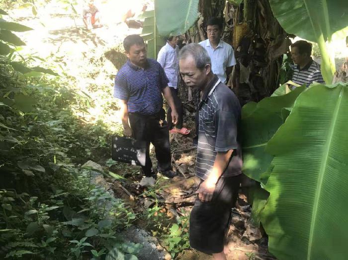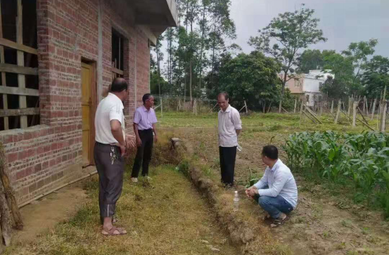 陈庆宁副局长(右二)与南渡司法所莫耀松所长(左二)实地勘察道路纠纷现场,调查纠纷情况。