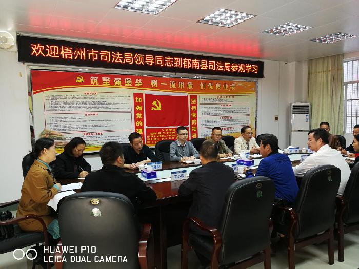 岑溪市司法局党组书记、局长莫健松,分管人民调解工作的副局长黎小云在梧州市司法局带领下到郁南县司法局参观学习,就人民调解工作相邻市司法局“取经”。