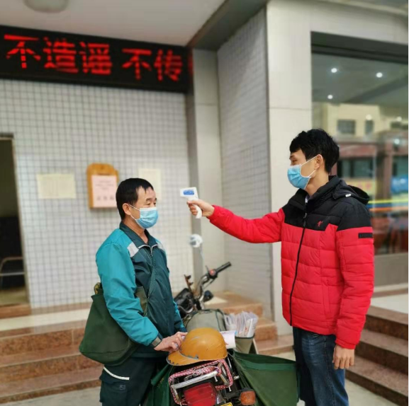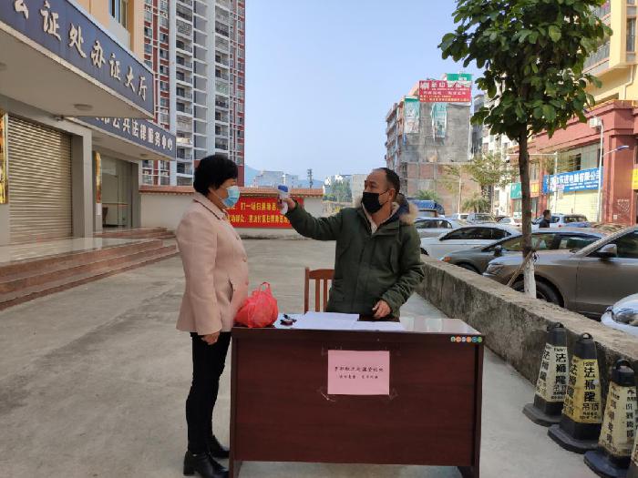 市司法局工作人员给前来送报刊的同志测量体温
