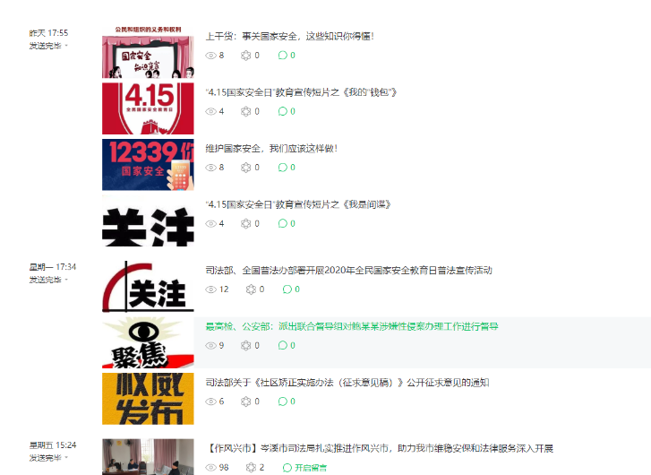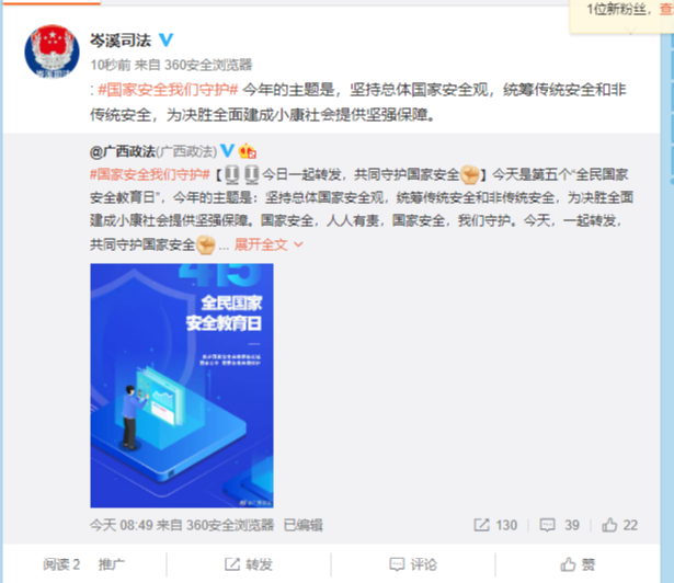 一是依托现代信息媒介,充分利用“岑溪司法”微信公众号、微博、工作群积极转发有关国家安全知识贴文、视频, 同时运用LED电子显示屏滚动播放国家安全宣传标语,致力于提高干部职工和人民群众的国家安全意识。截止4月15日上午,共利用“岑溪司法”微信公众号号、微博转发国家安全知识贴文12篇。