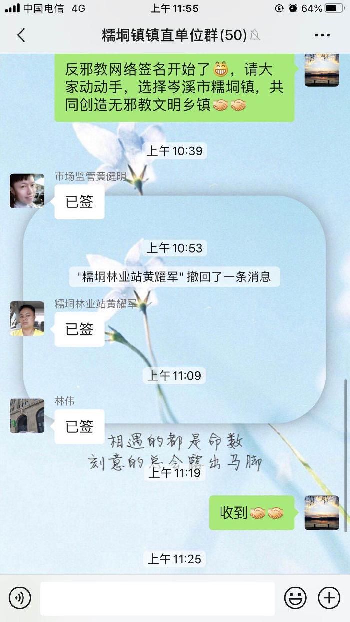 在反邪教宣传工作中,全镇党员干部带头,发动镇直各单位职工积极参与网络签名活动,并发动身边亲朋好友、学生家长等群体积极参与。目前,已发动3000余名干部群众进行网络签名,形成人人参与反邪教的社会局面。