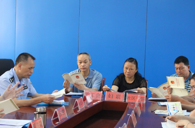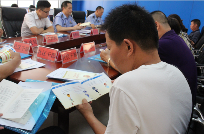 (与会人员在学习《中华人民共和国社区矫正法》及宣传小读本等宣传资料)