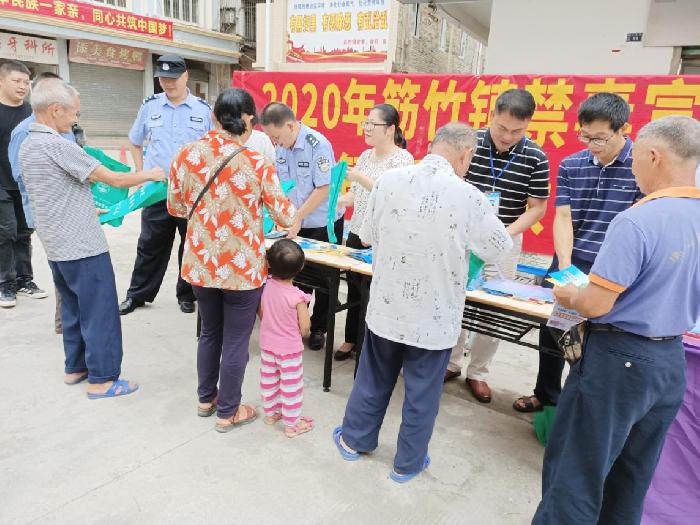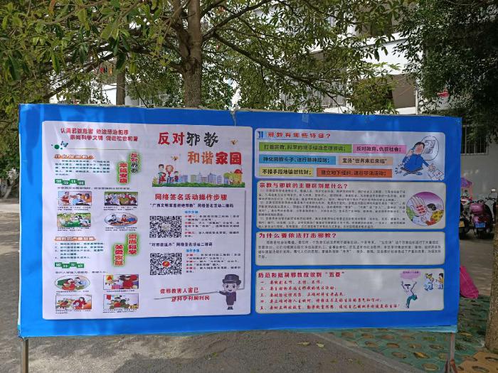 在镇政府门口街道,各部门工作人员采取摆摊设点、悬挂标语、发放资料,赠送标有禁毒、反邪教内容的手袋的方式,引导群众现场微信扫码参与“广西文明家庭拒绝邪教”和“对邪教说不”网络签名活动。活动现场,工作人员向群众讲解“什么是邪教”、“邪教有什么危害”、“遇到邪教活动怎么办”等知识内容,阐述了邪教的本质及严重危害性,让更多的人了解防范邪教知识,发现邪教组织、涉毒人员时能及时报警。