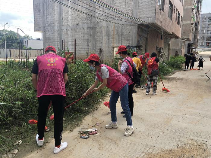 党员志愿者在清理社区道路两旁垃圾