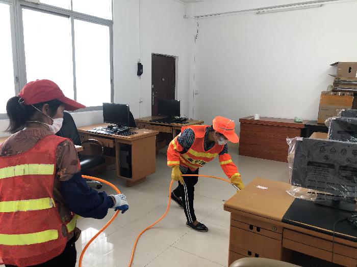 清洁工在办公室区域喷洒灭蚊药水
