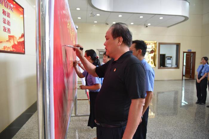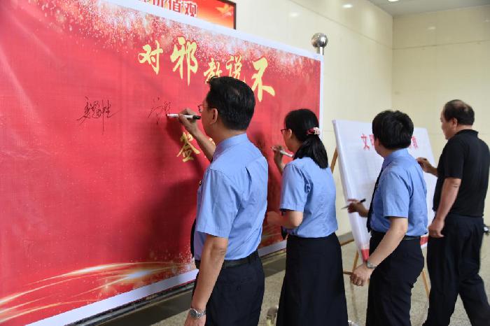 为进一步推动反邪教警示教育工作的深入开展,营造积极向上、健康和谐的社会环境。7月1日,岑溪市检察院组织全体干警开展反邪教现场签名活动。活动现场70多名检察干警郑重地在“对邪教说不”“文明家庭拒绝邪教”签名墙上分别签下名字,以表达自己坚定理想信念、坚决抵制邪教的决心。