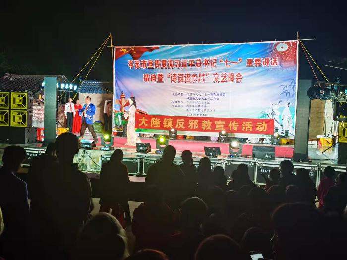 文艺晚会正式演出前,大隆镇旺坡村支书林洪平上台向村民做了禁毒反邪知识宣讲,包括当今流行的毒品种类以及吸食毒品后的生理反应和危害、毒品为何会使人上瘾、宗教与邪教的区别、邪教组织如何借用宗教和气功的名义散播迷信邪说、如何防止毒品和邪教侵害等知识。针对农村地区为易种植毒品原植物的高发区,支书特意向村民们普及了非法种植毒品原植物的危害和法律责任,并教育大家要做到不吸毒、不种毒、不制毒、不贩毒,村民凡是发现涉毒涉邪等违法犯罪行为的,要及时向村委和禁毒单位揭发。