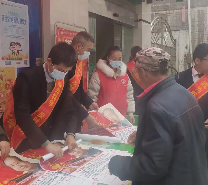 镇党委政法委员、人武部部长莫佳健向群众发放印年历