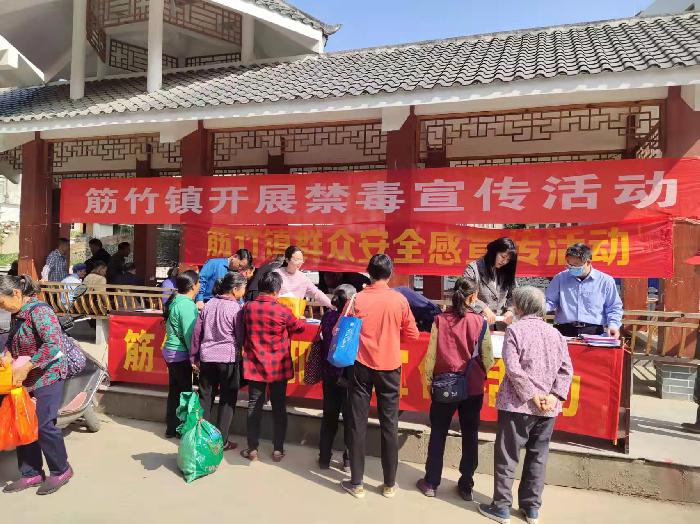 在筋竹镇幸福路街道,各部门工作人员通过悬挂宣传横幅、放置宣传展板、发放宣传资料、设立咨询台等形式向群众宣传禁毒反邪知识,详细讲解了邪教的本质、危害和日常表现形式,并以现实典型案例以案释法,深刻揭示了“法轮功”、“全能神”等邪教组织的本质和危害,引导大家自觉反对邪教、崇尚科学。