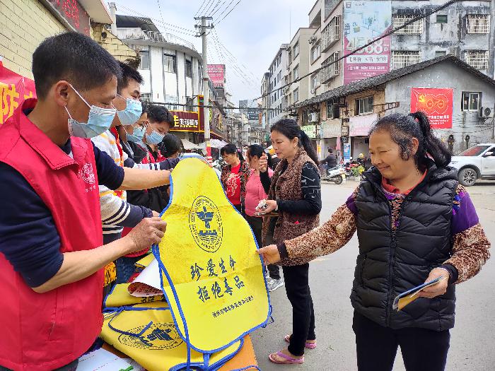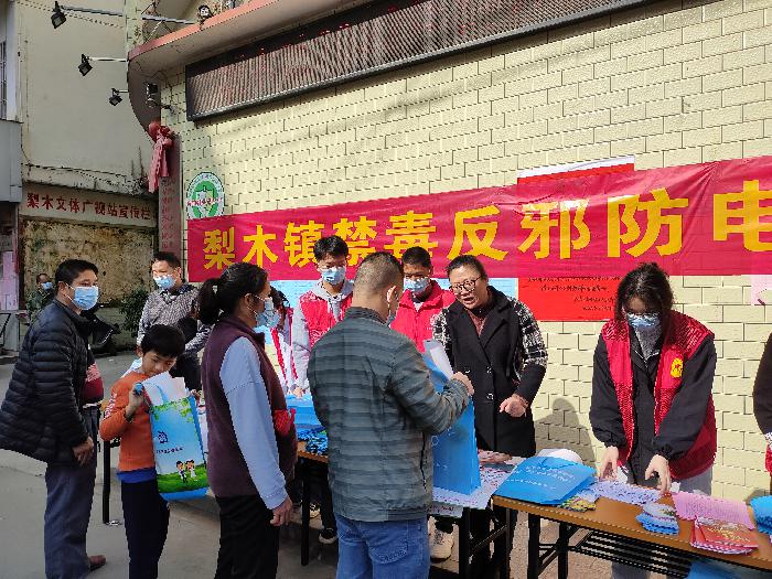 梨木镇综治办、禁毒办利用圩日,在街上派发印有“珍爱生命、远离毒品”、反邪教宣传小册子等宣传资料,反邪志愿者向过往群众介绍“法轮功”、“全能神”等邪教组织的本质和危害,揭发他们反科学反人类的本质,提醒辖区群众反对邪教,远离毒品,拒绝毒品,营造浓厚的学习氛围,让群众对反邪教、禁毒、防电诈等网格化信息入耳、入脑、入心,提高辖区群众安全感。