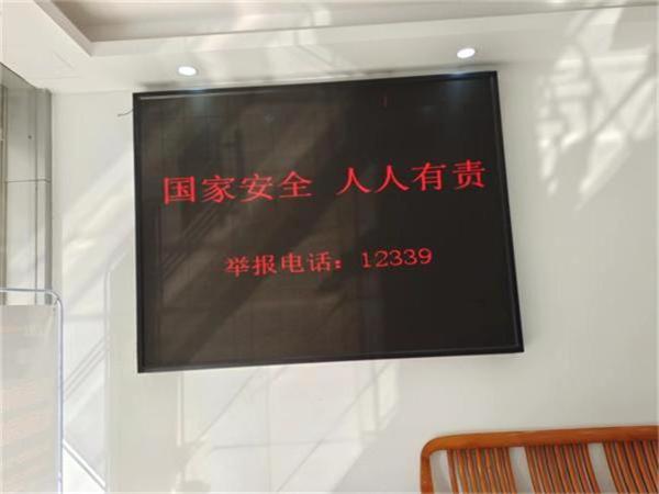 通过张贴国家安全宣传海报、利用LED电子显示屏滚动播放国家安全宣传标语的方式,给过往群众、前来办事的群众静态宣传国家安全知识,努力扩大国家安全知晓率、宣传覆盖面。