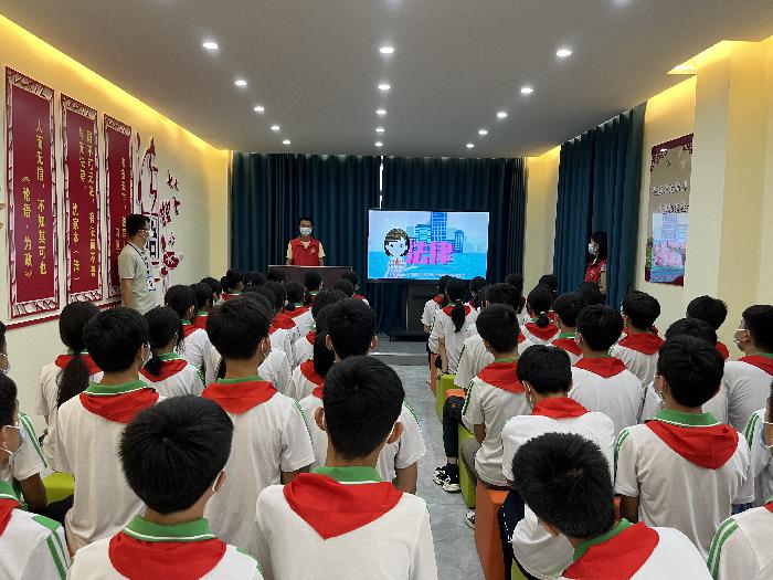 教育基地内正在播放的幽默诙谐法制教育校园情景剧吸引了同学们的注意,带队老师见此也结合校园实际,教导同学们如何辨别应对违法行为,传授自我保护知识。