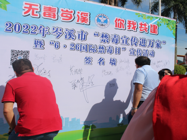 司法局副局长钟戈铭(右一)在禁毒宣传活动签名墙上签字