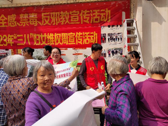活动中,工作人员发放《宪法》《民法典》《反家庭暴力法》《婚姻法》《妇女权益保障法》等关系妇女权益、家庭教育相关的法律法规宣传资料,同时科普了防毒、防邪、防电信诈骗等与群众息息相关的日常知识,用通俗易懂的语言向群众讲解“什么是邪教”“如何抵制邪教”等基本常识,让群众了解生活中可能遇到的邪教组织及如何防范的知识,并呼吁大家一定要远离毒品,坚决抵制毒品,为家庭幸福营造一个安定祥和的环境。