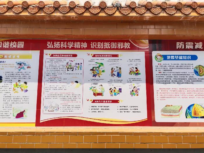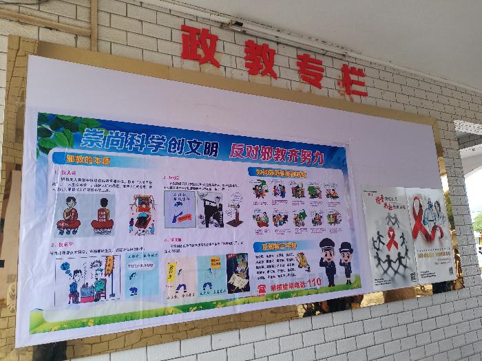 通过在校园设立反邪教宣传栏用以宣传反对邪教的警示标语,加强反邪教宣传阵地建设,警醒师生们防邪反邪。使师生们潜移默化接受防邪、防诈、防范教育,能够自觉做到“崇尚科学 抵制邪教”,对邪教做到“不信、不听、不传、不看”