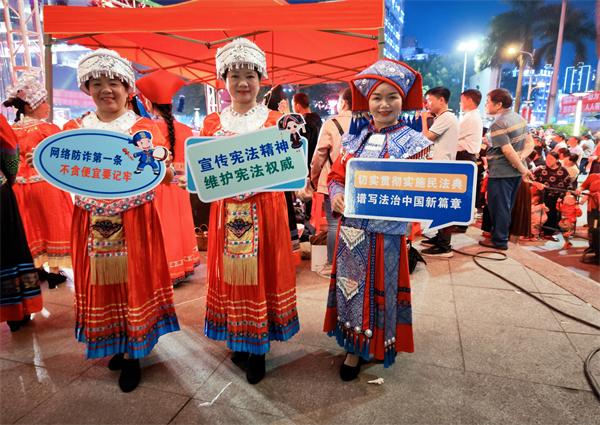 “春天花开朵连朵,壮族节日要唱歌;山歌宣传毒危害,共创无毒民安乐……”舞台上,身着民族特色服装的歌手们洋溢着笑容,将宪法、民法典、禁毒法等法律法规内容,以通俗易懂、生动形象的山歌形式婉转表达出来,唱出“法治就在生活中”的意境,博得观众拍手叫好。