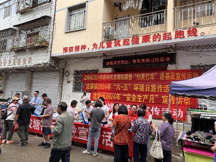 2024年6月6日,处于高考季且正值波塘镇圩日,波塘镇联合综治办、禁毒办、文化站、司法所等部门的干部职工组成宣传工作队开展禁毒、反邪教宣传教育活动。