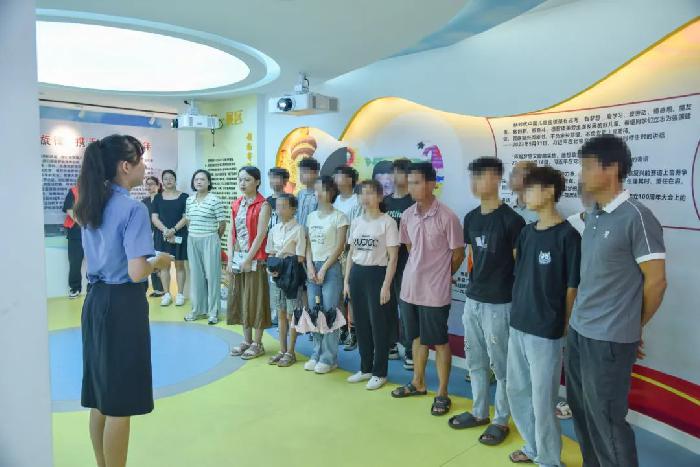 “欢迎大家前来参观基地。”旁听庭审结束后,罪错未成年人及其家长来到岑溪市人民检察院未成年人法治教育实践基地参观。检察干警通过播放法治视频、案例分析、问答互动等形式,带领大家一一参观领袖寄语、法治展厅等六个展厅,全面细致了解学生欺凌、预防性侵、远离毒品等法律知识。该基地融法治教育、司法办案、观护帮教于一体,通过实践教育、法治教育与现代多媒体技术、智能技术相结合,用新颖有趣的形式提高罪错未成年人及其家长的学法、懂法、用法意识。