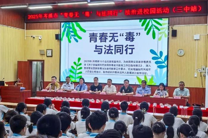“毒品危害不容轻视,青春健康需自我守护……”市委政法委、市人民法院、市人民检察院、市公安局的工作人员化身“法治导师”,为学生们带来了一场场干货满满的法治课。工作人员们结合《禁毒法》《未成年人保护法》等法律法规,通过真实案例剖析,揭示了麻精药品滥用、新型毒品伪装等潜在风险,详细介绍了毒品的种类及其对青少年身心健康的长期影响,强调青少年应“提高警惕、拒绝诱惑、学会求助”。