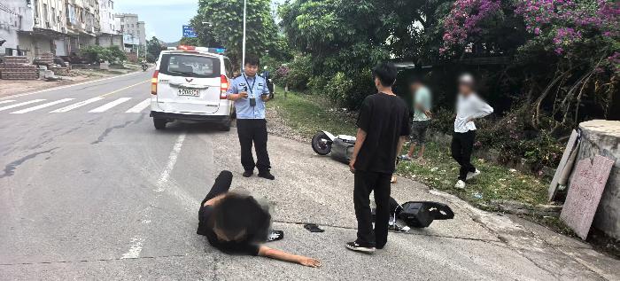 走近一看,伤者腿上、头上都擦破了,额头还在流血,意识也有些不清楚。“师傅!能听见我说话不?”民警许承跃蹲下身轻声喊着,一边查看伤势。另一边,民警谢永坤已经拨通了120 和 122 电话,语速快却清楚地报着位置:“马路镇善村路段,有个骑电动车的摔伤了,需要救护车和交警过来!”